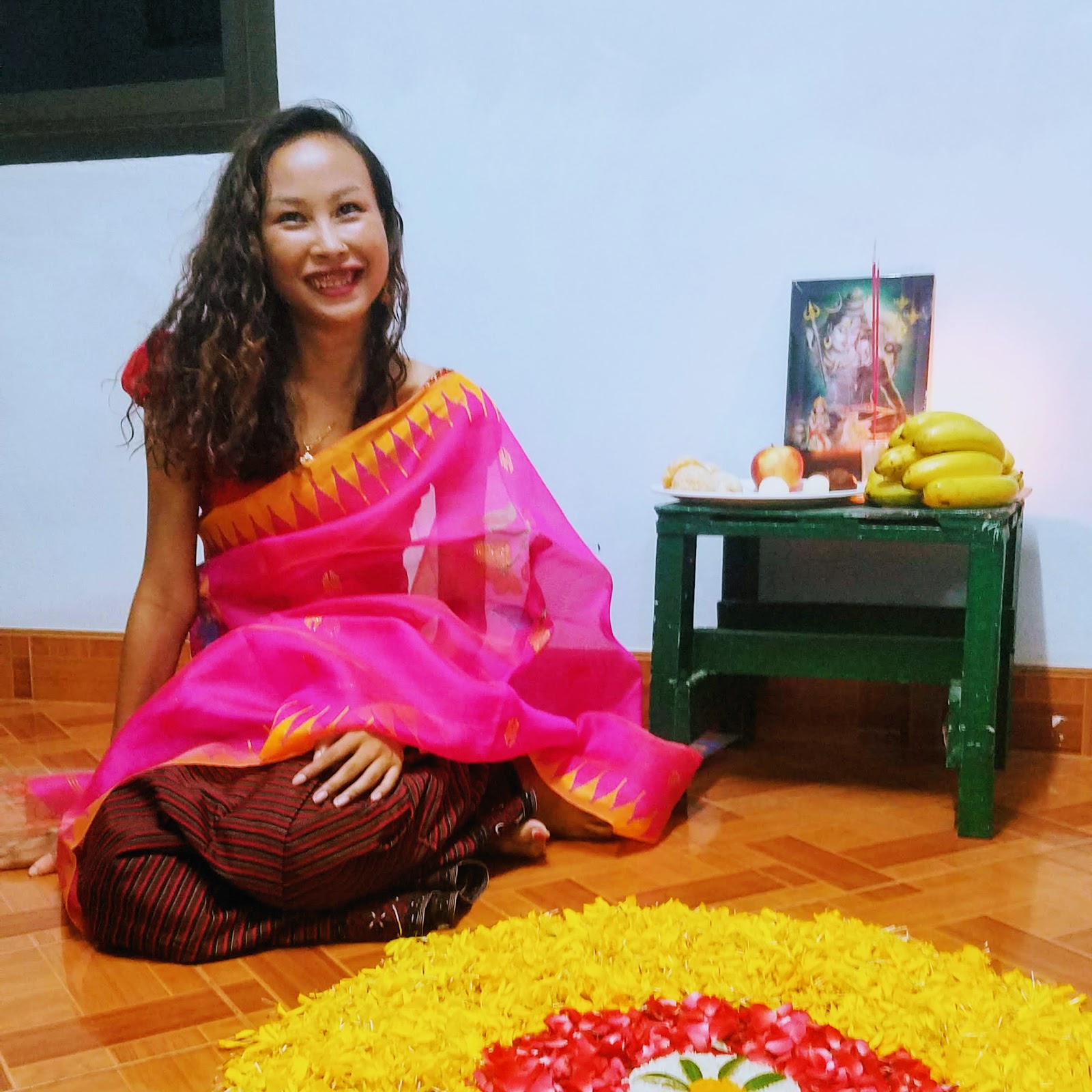 At dusk Shirley guided us in decorating the altar, using dry rice and colorful flower petals to create concentric circles in front of the altar. She then directed us to light dozens of candles on her front porch as she prepared a plate of fruit to lay on that altar. Passing light from candle to candle swirled warm Christmas Eve memories around my mind. Three little girls from the neighborhood came by to see what we were doing. The best I could explain in Thai, I said we were celebrating an Indian Holiday with Teacher Shirley. "India Day!" they exclaimed and ran off giggling.